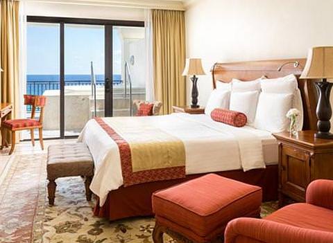 Ocean view rooms with soundproof windows and balcony. One king or two double beds. Marble bathroom with shower and tub.